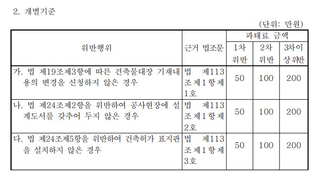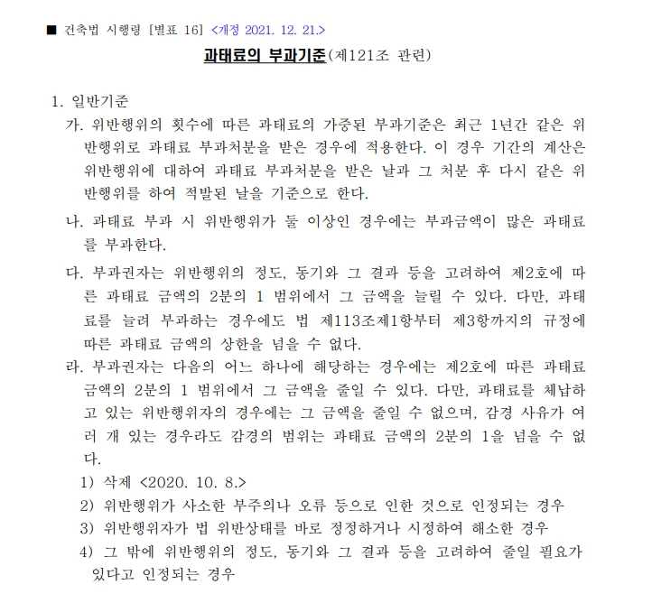 건축법 과태료에 대한 정보를 모아봄 / 과태료의 부과기준(제121조 관련)