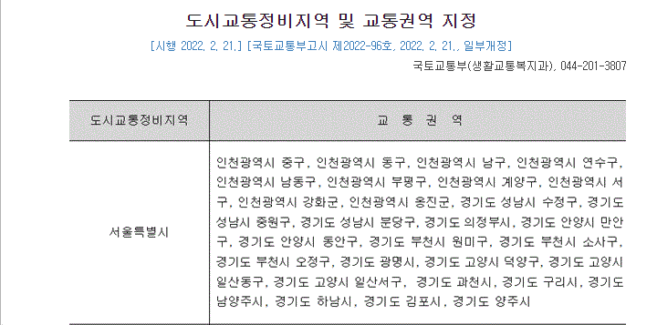 제3조(도시교통정비지역의 지정ㆍ고시) ① 국토교통부장관은 도시교통의 원활한 소통과 교통편의의 증진 및 환경친화적 보전ㆍ관리를 위하여 다음 각 호의 지역을 도시교통정비지역으로 지정ㆍ고시할 수 있다. <개정 2013. 3. 23., 2021. 1. 5.>
