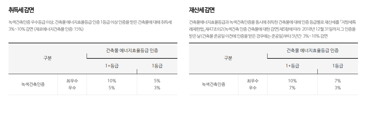 취득세 감면 부분은 녹색건축인증 우수등급 이상, 건축물 에너지효율등급 인증 1등급 이상 인증을 받은 건축물에 대해 취득세 3%~10% 감면 (제로에너지건축물 인증: 15%)